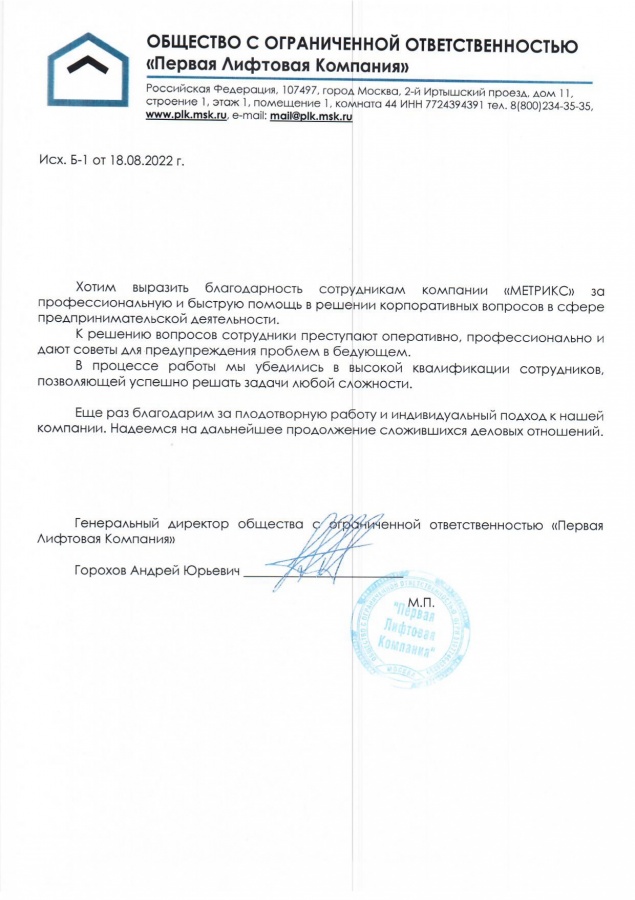 Благодарность ООО Специализированный подрядчик "Лифтовая компания"